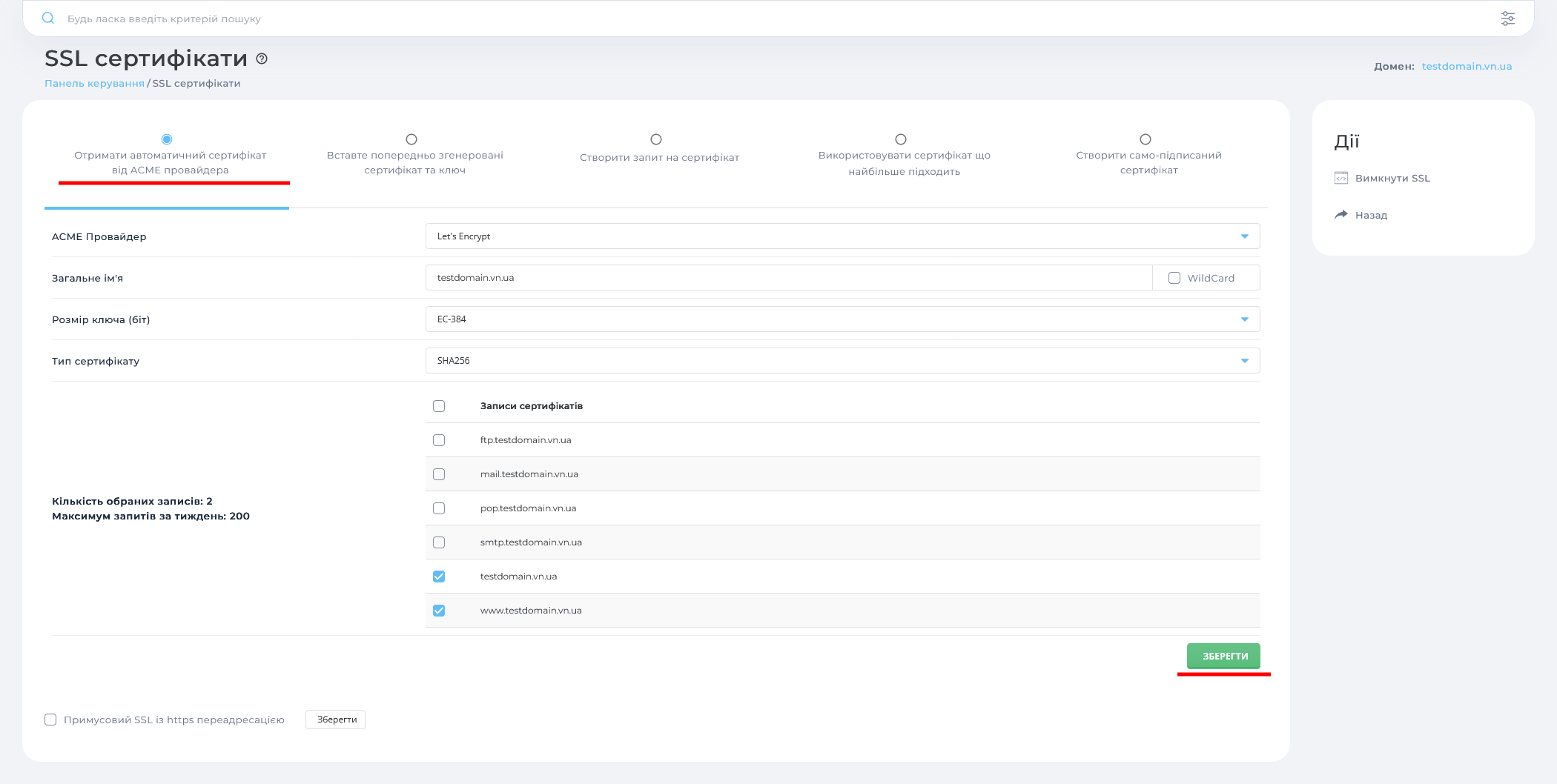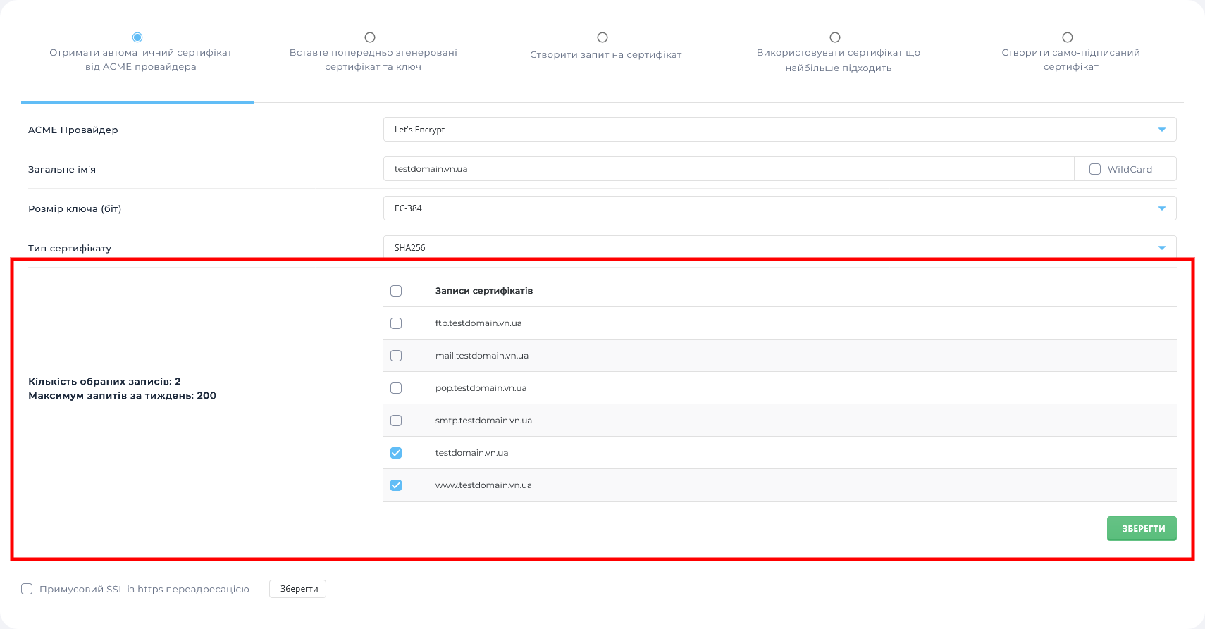 У полі "Записи сертифікатів" можна позначити піддомени, на які буде розповсюджуватись сертифікат. Після цього клацніть на "Зберегти", протягом хвилини сертифікат має бути створений.