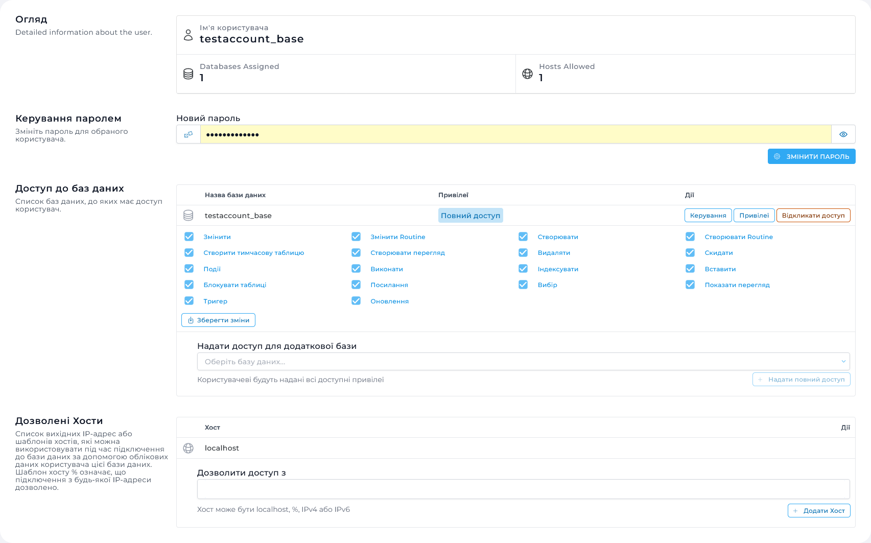 - Надання або ж відкликання доступ до тієї чи іншої бази даних, редагування привілеїв,