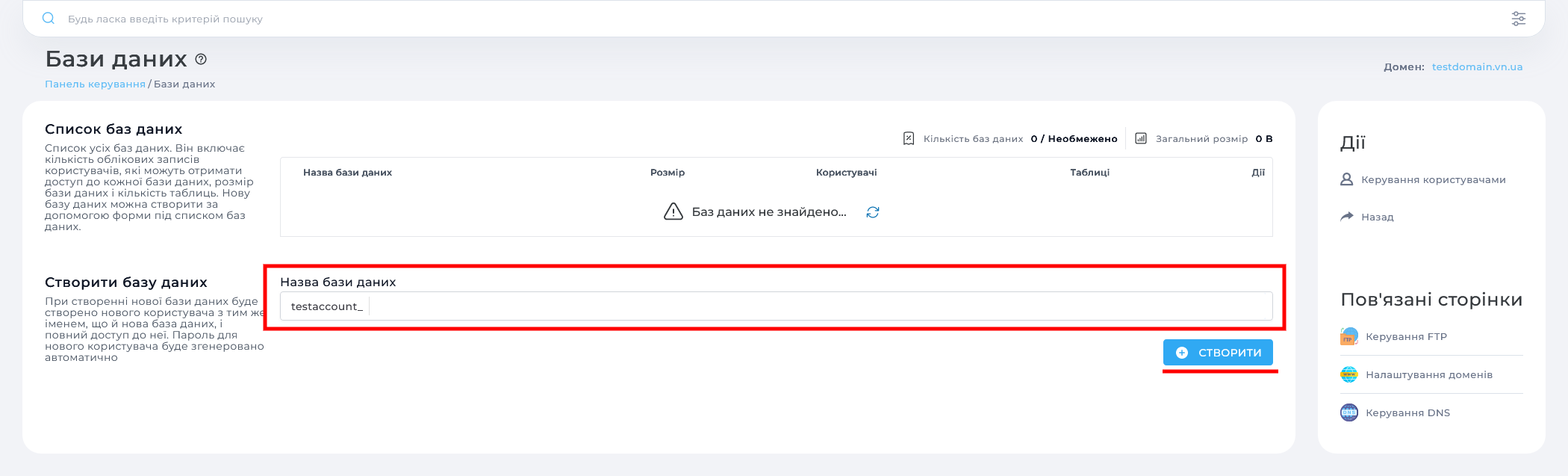 В полі "Назва бази даних" вкажіть ім'я бази даних, та клацніть на "Створити".