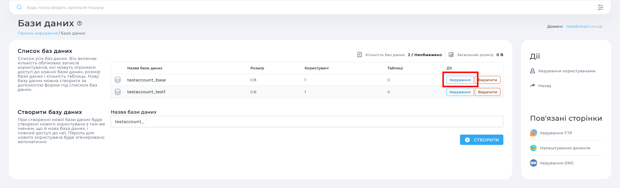 Для керування базами даних, перейдіть до розділу "Керування акаунтом" пункт "Бази даних". Навпроти необхідної бази даних клацніть на "Керування".