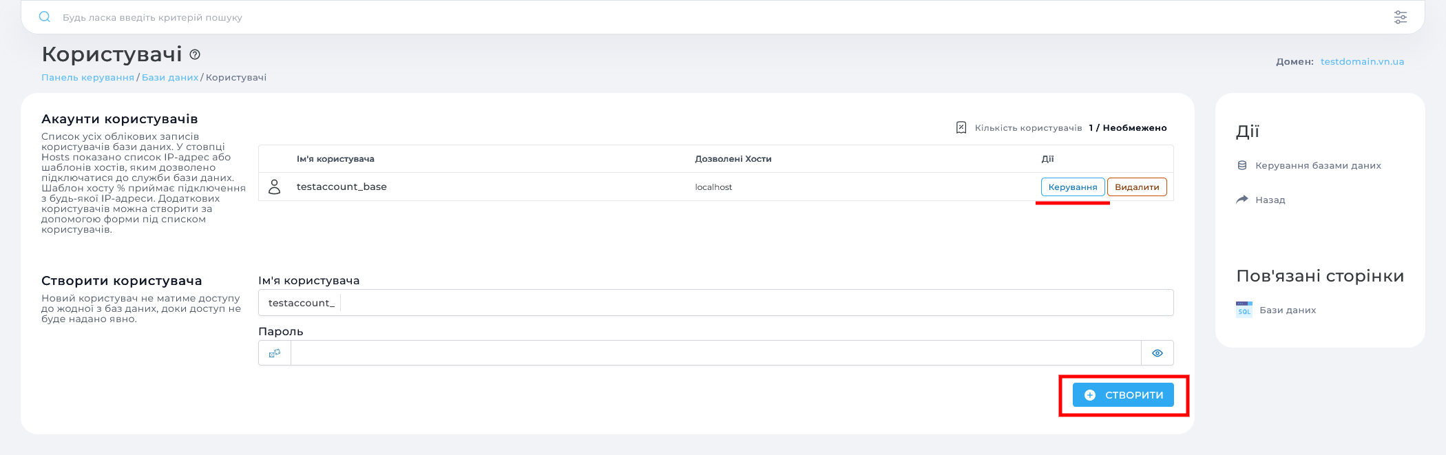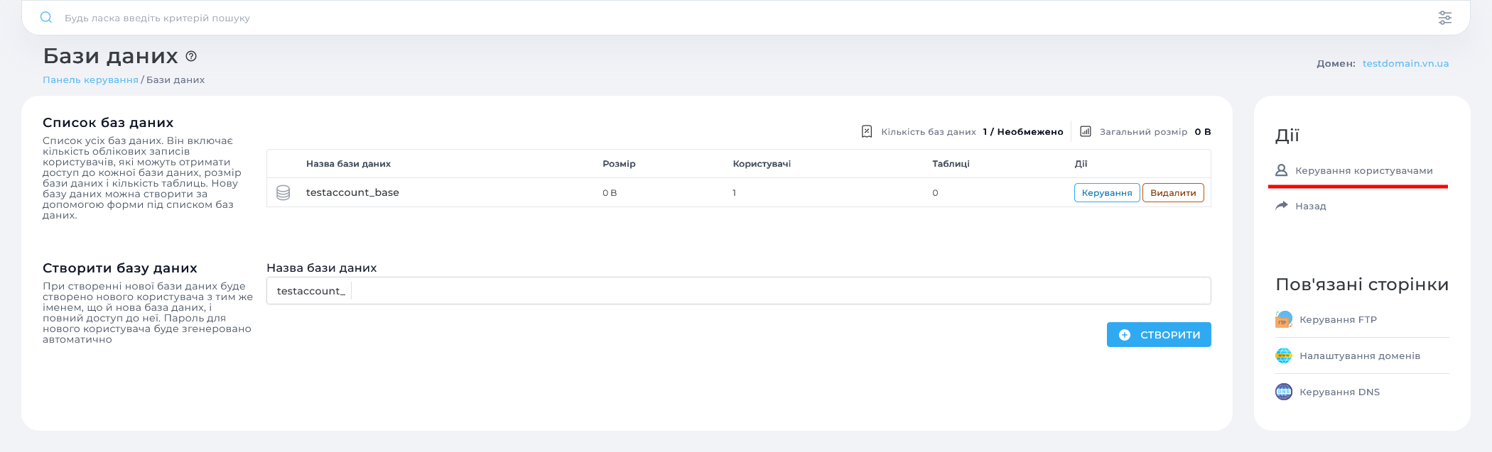 Для керування користувачами бази даних, перейдіть до розділу "Керування акаунтом" пункт "Бази даних". Справа в блоці дії оберіть "Керування користувачами".