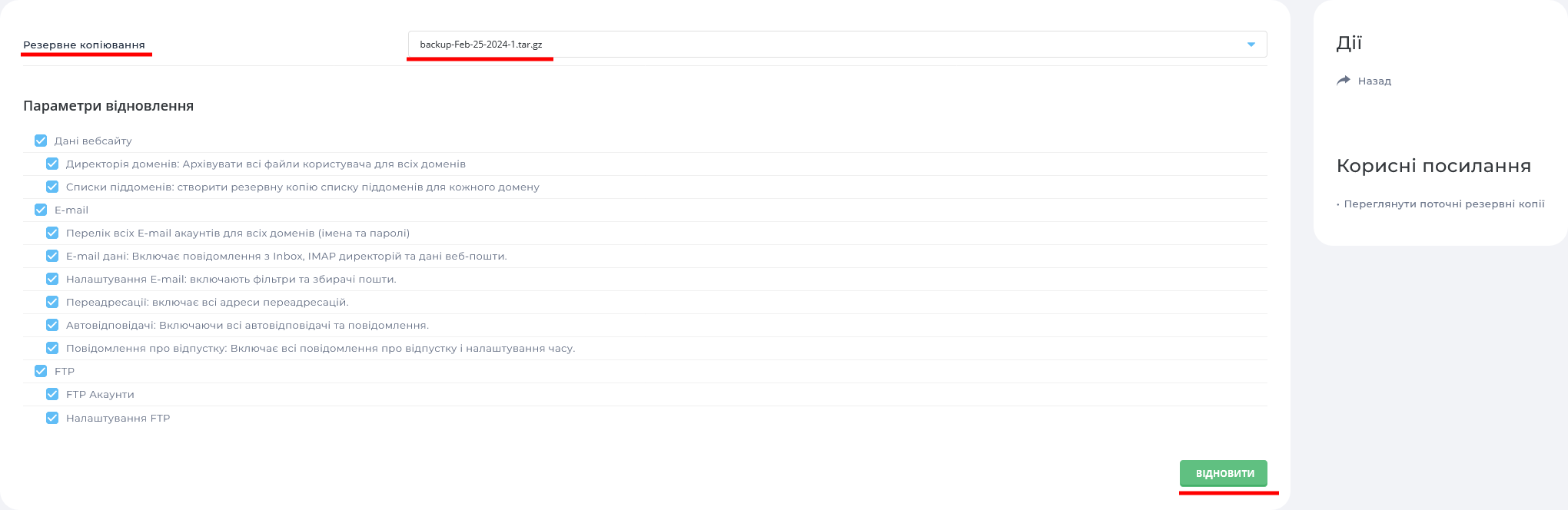 В полі "Резервне копіювання" відображатимуться резервні копії які знаходяться в директорії backups.