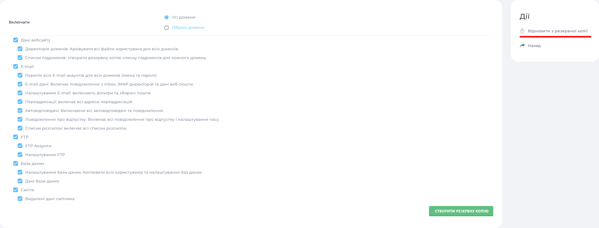 Пункти, які позначені у списку, будуть включені до резервної копії. За потреби можна зняти позначки з деяких пунктів, наприклад, "Сміття". Для створення резервної копії клацніть на "Створити резервну копію".